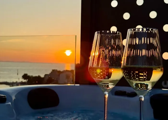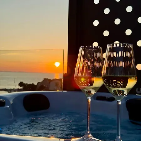 Dedaj Resort - Penthouse Auri Zadar med 1 sovrum, som har en terrass, ligger bara några meter från Borik Beach. I den strandnära 106 m² stora lägenheten erbjuder hydromassagebadkar, vilket garanterar en mer avkopplande vistelse.